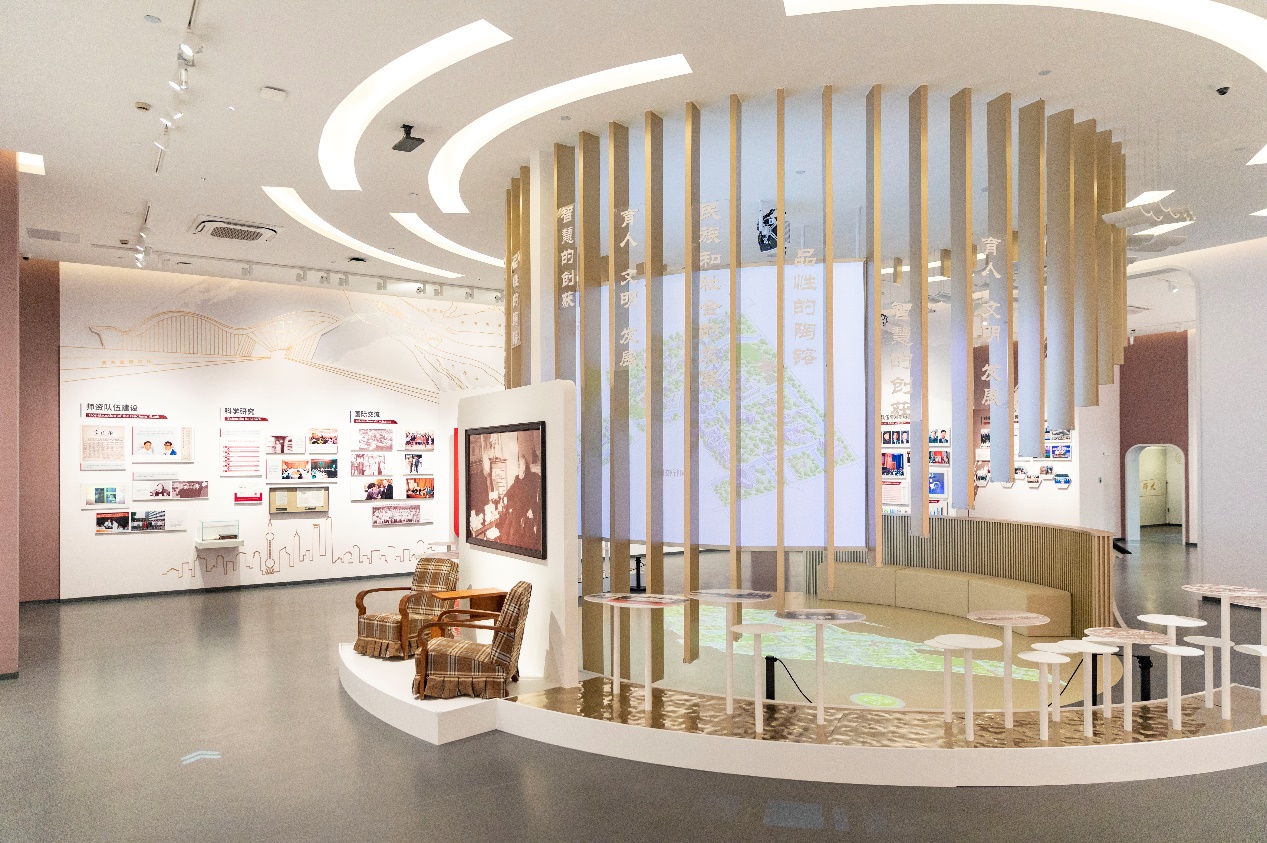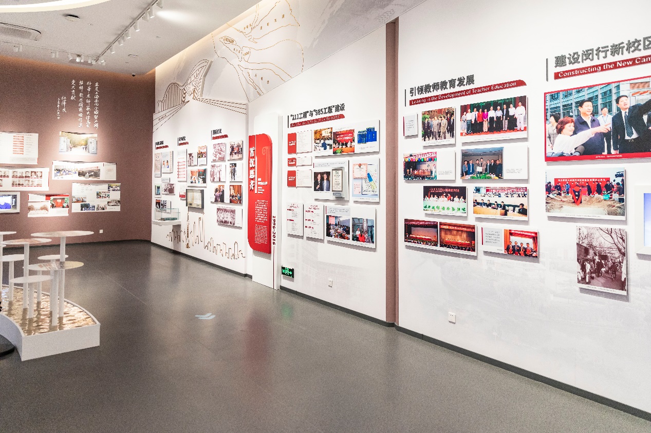 在展陈空间上,校史展览实行“1+1方案”,即校史在校史馆展陈,人物在群贤堂展示,达到了校史展陈和历史建筑的完美融合。新校史馆总建筑面积4000平方米,其中主体占地400多平方米,展陈内容主要包括五大部分,即:缔建新中国第一所社会主义师范大学、探索新型社会主义师范大学(1951-1977)、建设高水平综合性研究型大学(1978-1995)、创建世界知名大学(1996-2016),以及扎根中国大地,建设世界一流大学(2017- )。通过图文、视频、实物、互动等多种方式,全景式展现华东师大建校70年和办学142年来的文化传统、办学成果和社会贡献。